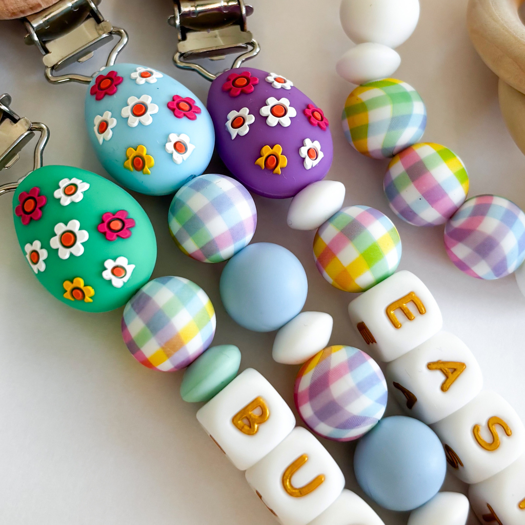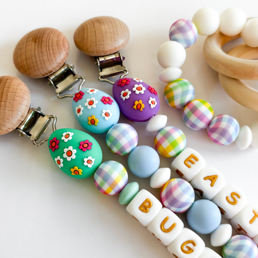 Easter Egg Personalized Pacifier Clips • Colorful Spring Tulip Flowers + Easter Bunny Styles • New Mom Gift