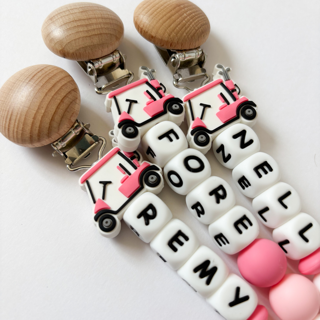 Personalize your golf pacifier clip with any newborn baby boy or girl's name ◦ Avoid dropped + dirty binkies using this clip ◦ Designed to keep your little birdie calm + comforted knowing their paci is by their side ◦ Handmade to last with soft silicone beads, with the top bead featuring a green golf cart with a message that notes 'Let’s Roll' ◦ Layered with neutral letter beads + a wooden clip that securely snaps onto baby blankets, bibs, toys, clothes + diaper bags ◦ Surprise a new golf mom + dad with a golf clip as a coming home gift or include it in your baby gift basket or gift box ◦ Make it a memorable gift for a hole in one birthday par-tee, baby shower, or nursery with a sports or golf theme ⛳️