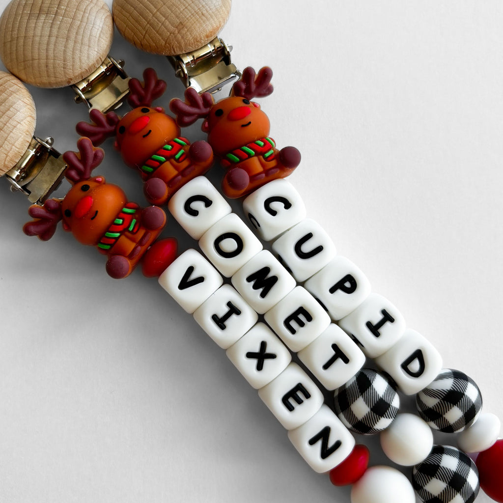🎄Silicone Beads: Handmade with a rudolph the red nosed reindeer layered with silicone soft neutral, white, green, red, gingham printed beads + letter beads